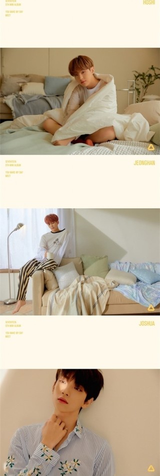 人民网讯 4日,韩国男团SEVENTEEN的迷你5辑《YOU MAKE MY DAY》官方预告照MEET版本公开。
