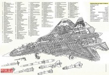据目前的公开资料显示,苏-57全机长19.8米,翼展13.95米,机高4.74米,最大起飞重量35.4吨。 图为外国军事刊物绘制的T-50剖面结构图(推测)。