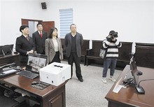 图为黄美媚(左三)来到永康法院古丽法庭观看涉农案件庭审录像。 罗文武 摄
