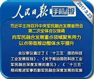 中共中央总书记、国家主席、中央军委主席、中央军民融合发展委员会主任习近平22日上午主持召开中央军民融合发展委员会第二次全体会议并发表重要讲话。习近平强调,推动军民融合发展是一个系统工程,要善于运用系统科学、系统思维、系统方法研究解决问题,既要加强顶层设计又要坚持重点突破,既要抓好当前又要谋好长远,强化需求对接,强化改革创新,强化资源整合,向重点领域聚焦用力,以点带面推动整体水平提升,加快形成全要素、多领域、高效益的军民融合深度发展格局。会议审议通过了《“十三五”国防科技工业发展规划》、《关于推动国防科技工业军民融合深度发展的意见》、《“十三五”期间推进军事后勤军民融合深度发展的实施意见》、《经济建设与国防建设密切相关的建设项目贯彻国防要求管理办法(试行)》,部署了当前和今后一个时期工作。(新华社)
