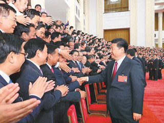 中共中央总书记、国家主席、中央军委主席习近平25日下午在人民大会堂亲切会见了出席党的十九大代表、特邀代表和列席人员,并同大家合影留念。下午4时,习近平等步入宴会厅,全场响起长时间热烈的掌声。习近平等领导同志向大家挥手致意,走到代表们面前,同前几排同志亲切握手,不时互动交流,向他们问好。代表们纷纷向习近平等领导同志致意,送上热情的问候。大厅内,真情涌动,暖意融融,掌声、欢呼声经久不息。(新华社)