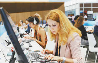 6月10日,上海合作组织成员国元首理事会第十八次会议在青岛国际会议中心举行。图为在上合组织青岛峰会新闻中心,外国记者正在工作。