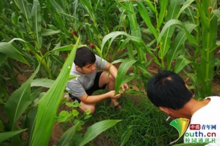 徐泽敏在农户地里调研玉米种植受灾情况。本人供图