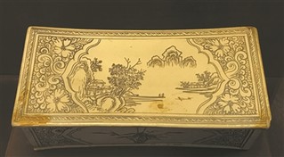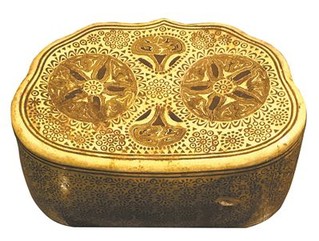 黄釉绞胎印花如意形枕