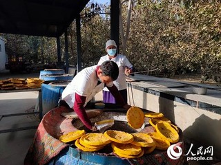 努尔敦·乎皮丁带着工人加工包谷馕。人民网 萨妮娅摄
