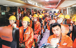 中铁隧道局的工人坐着大巴进入长度为5820.21米的引汉济渭工程秦岭输水隧洞4号斜井。