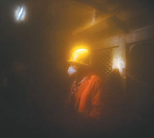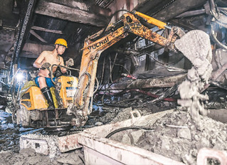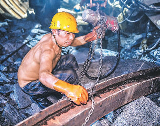 工人在掘进机的底部清理渣石。