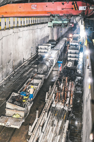 中铁隧道局的技术员在掘进机机头处检查钢拱架的安装。