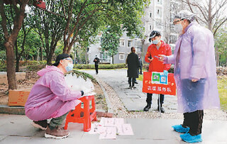 图三为2月,在武汉市江岸区百步亭社区龙庭小区,志愿者张良(左一)向居民核对其团购商品的信息。
