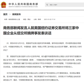 问:美东时间12月31日,美国纽约证券交易所发布新闻稿,宣布将启动程序,把中国电信股份有限公司、中国移动有限公司、中国联通(香港)有限公司等三家中国企业从纽交所“摘牌”。请问发言人有何评论?