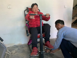 “为了让她早日康复,我想尽了办法。”堂屋角落里摆着很多用过的康复器具,有脚踏车、握力球、扶手支架等。腾德付还自己焊制了两条约6米长的简易栏杆,摆放在房屋前坪,供妻子练习走路。