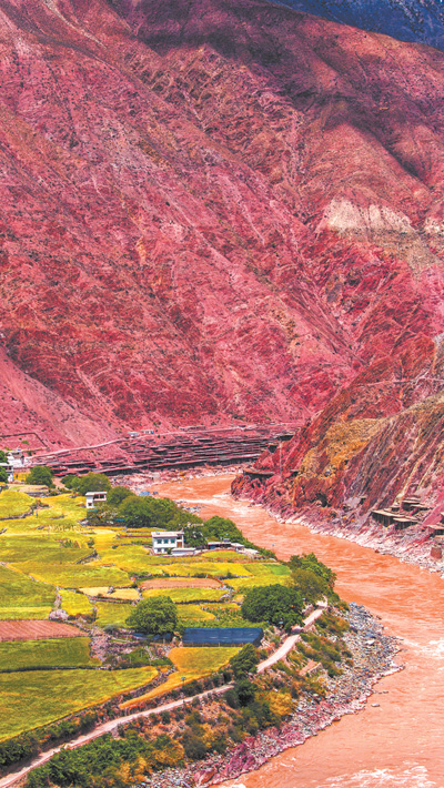西藏自治区芒康县曲孜卡乡的澜沧江大峡谷,江边是村庄与盐田。