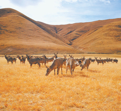 西藏自治区类乌齐县长毛岭国家级马鹿自然保护区,国家二级保护动物马鹿在悠闲觅食。