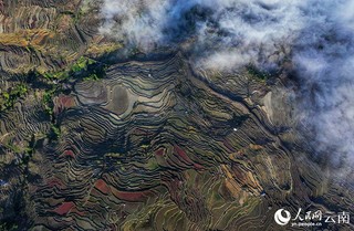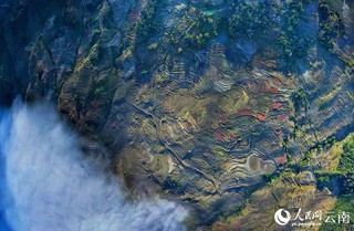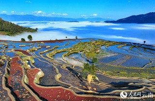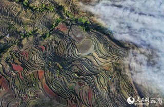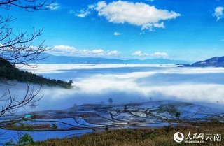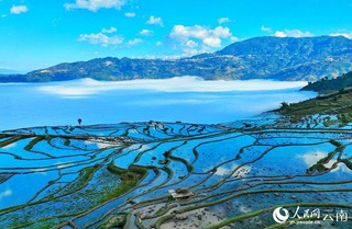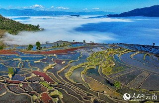 人民网红河1月21日电 近日,位于云南省红河哈尼族彝族自治州红河县的撒玛坝梯田已全部灌水,云雾缭绕,景美如画,迎来最佳观赏季。
