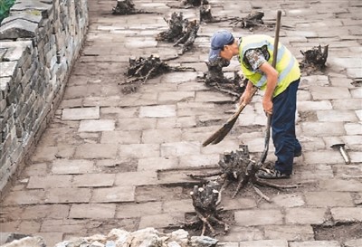 工作人员在箭扣长城研究性修缮考古发掘过程中保留了长城遗址上残留的树根,以此将对长城植物病害作进一步研究。 |
