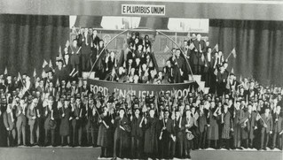 然而,这种自发式的排除异己行为无法阻挡汹涌的移民潮。为此,20世纪初,一些盎格鲁-撒克逊清教徒中的“有识之士”,主张对来自各国的移民加强“美国化”。福特公司的创始人亨利·福特曾设立福特英文学校(Ford English School),通过用英文教授美国的“主流”生活方式来促进移民的文化认同。每期结业时,还会举办富有象征意味的“熔炉”毕业典礼,典礼在市内最大的礼堂举行,礼堂舞台上放着代表移民之船的道具,对面是一个巨大的“熔炉”(实际上是一个道具黑箱)。学员在典礼上穿着本民族服装,背着他们踏上美国土地时所带的行李,走下“船板”,接着“跳进”熔炉后“消失”。随着学校老师搅动长勺道具的象征性表演,学员们变装为西装革履的“美国人”,挥舞着美国国旗从“熔炉”中走出来。这个仪式的含义是,走出这个“熔炉”,无论学员来自哪个国家,从此刻起,他们都成了“美国人”。