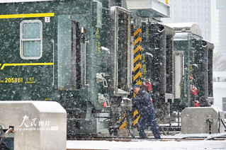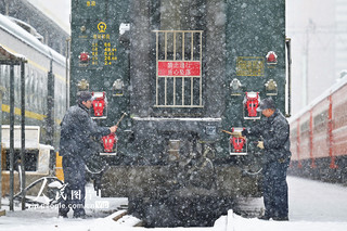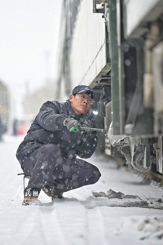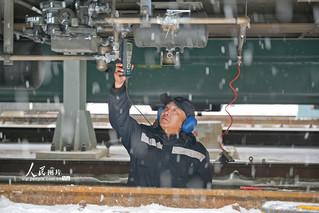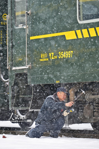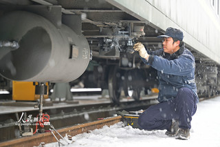 2024年2月2日,河南郑州迎新一轮降雪,郑州车辆段郑州客车整备所的客车检车员们在雪中坚守岗位,及时检修入库列车,整治安全隐患。