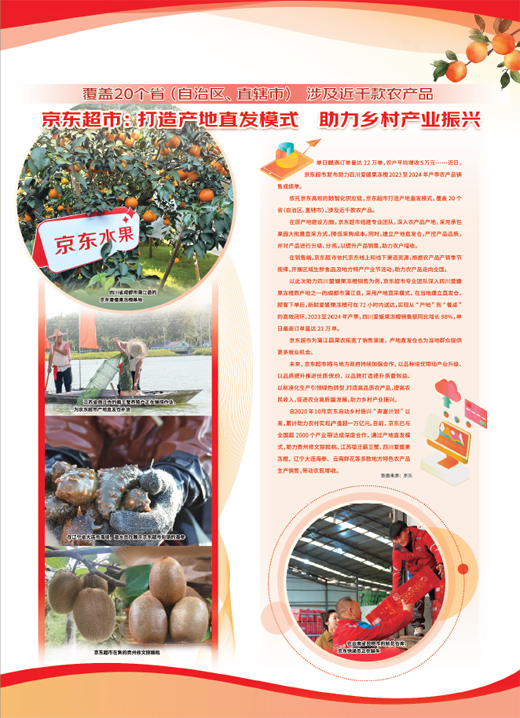 以此次助力四川爱媛果冻橙销售为例,京东超市专业团队深入四川爱媛果冻橙原产地之一的成都市蒲江县,采用产地直采模式,在当地建立直发仓,顾客下单后,新鲜爱媛果冻橙可在72小时内送达,实现从“产地”到“餐桌”的高效闭环。2023至2024年产季,四川爱媛果冻橙销售额同比增长98%,单日最高订单量达22万单。