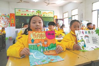 3月20日,枞阳县城关小学的学生在展示他们创作的节水主题宣传画。当日,枞阳县水利局开展“节水,从我做起”节水宣传活动,让孩子们了解水资源科普知识,树立节能环保的生活态度。通讯员 王章志 摄