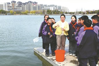 3月21日,阜阳市颍东区岳家湖小学的老师和学生们在岳家湖公园学习了解水知识。该校举行“珍惜水资源、从我做起”主题教育活动,让学生们进一步增强节水护水意识。 特约摄影 王 彪 摄