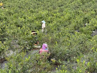 田垄之间,蓝莓大批量成熟,采摘工人穿梭其中,手法熟练地将一颗颗诱人的蓝莓“收入囊中”。