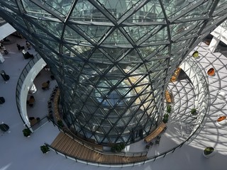外方内圆的图书馆中心内嵌中央网壳钢结构玻璃幕墙,上口直径35米,下口直径17.37米,中间最窄处直径15.72米,高25.18米,最高点30.18米。896块三角形玻璃以铸钢节点为中心焊拼在一起,曲线优美,清新明亮,就像一个透明“大腰鼓”,玻璃用量达118吨,是整个图书馆建设难度最高,施工工艺最复杂,也是最具特色的工程。
